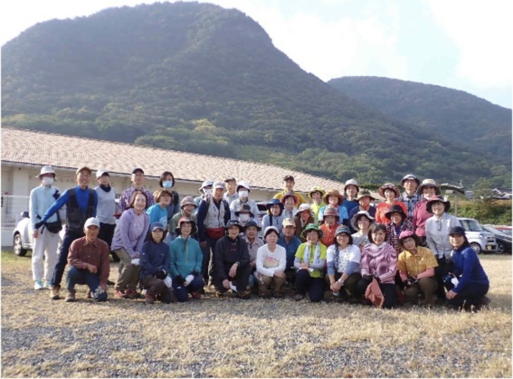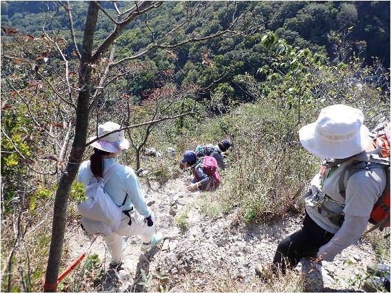 花の公園に集合し、開会式のあと全員で大坂峠まで行き、1.筆の山、2.我拝師山に分かれて登山。私たちは筆の山へ。途中傾斜のある場所でロープワークのトレーニングをしました。